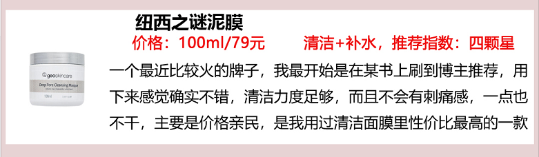 科顏氏、悅木之源、雪花秀、紐西之謎深度測評?。。”救四w質偏干,但是T字區出油很厲害,黑頭、毛孔粗大等常見問題,我的臉上都有,嗚嗚嗚...前前后后用過很多清潔泥膜,一周兩次堅持了很久,黑頭光光,嬌嫩白皙就是我本人。